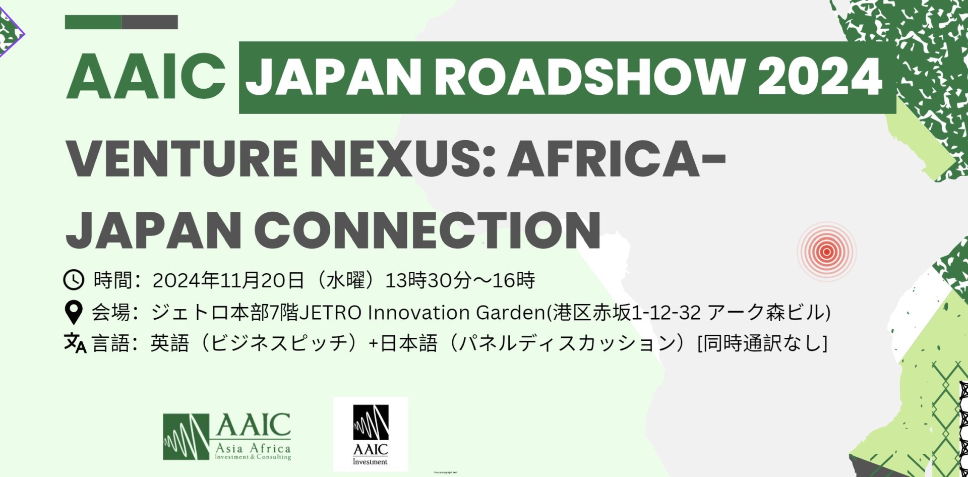 AAIC Investment Pte. Ltd.(以下、AAIC Investment)では、弊社ファンド(AHF1号・2号)の投資先のアフリカ企業と、日本企業との協業を促進するAAIC Japan Roadshowを開催致します(11月18日(月)~22日(金))。そして同期間のメインイベントとして、11月20日(水)にVenture Nexus: Africa-Japan Connectionを実施致します。 このイベントは二部構成です。 第一部ではロードショーでアフリカから招聘している10社(弊社ファンド投資先)の全社がビジネスピッチを行い、第二部はパネルディスカッションにて弊社ファンドの投資先企業と日本企業の協業先行事例を深く掘り下げます。 アフリカビジネスにご関心のある方は、是非奮ってご参加ください。 ●開催概要 -日時: 2024年11月20日(水)13:30-16:00 (開場13:00) -場所:ジェトロ東京本部7階 “JETRO Innovation Garden” /東京都港区赤坂1丁目12-32 アーク森ビル、JETRO本部7階イノベーションガーデン アーク森ビル:https://www.arkhills.com/access/ -主催:AAIC Investment ●プログラム内容 -PART1: アフリカ企業(弊社ファンド投資先)10社によるピッチ -PART2: 「投資ファンドを通じた日本企業と現地スタートアップとのアフリカ市場における新たな価値創造」 ●申込 -参加ご希望の方は、以下のリンクから必要事項をご記入の上、お申込みください。 ※定員に達し次第、申込を締切らせていただく場合がございます。 [申込リンク] ●参加企業・登壇者について□第一部 :アフリカ企業11社について(弊社ファンド投資先)