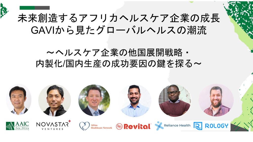 この機会に、11月18日(月)パネルディスカッションイベント、「未来創造するアフリカ企業の成長とGAVIから見たグローバルヘルスの潮流」を開催致します。当日はアフリカから来日する創業者、経営陣等が登壇し、第二部パネルではケニアから来日中のNovastarの山内様にモデレーターを務めて頂きます。また、第三部でGAVIの長嶺様よりグローバルヘルスのトレンドをお話しいただきます。